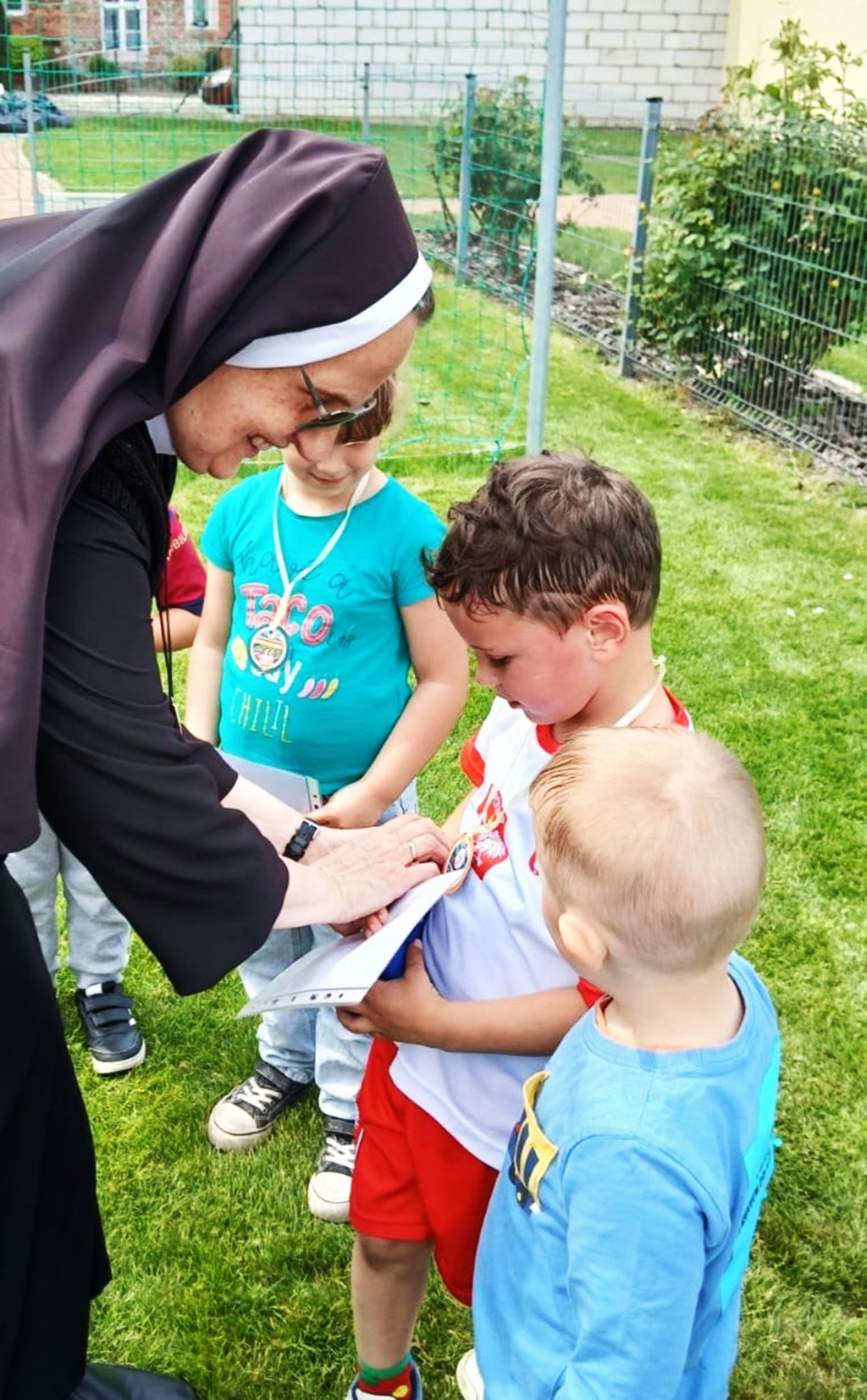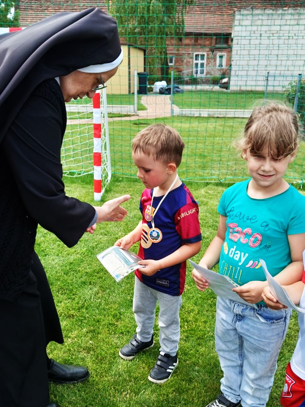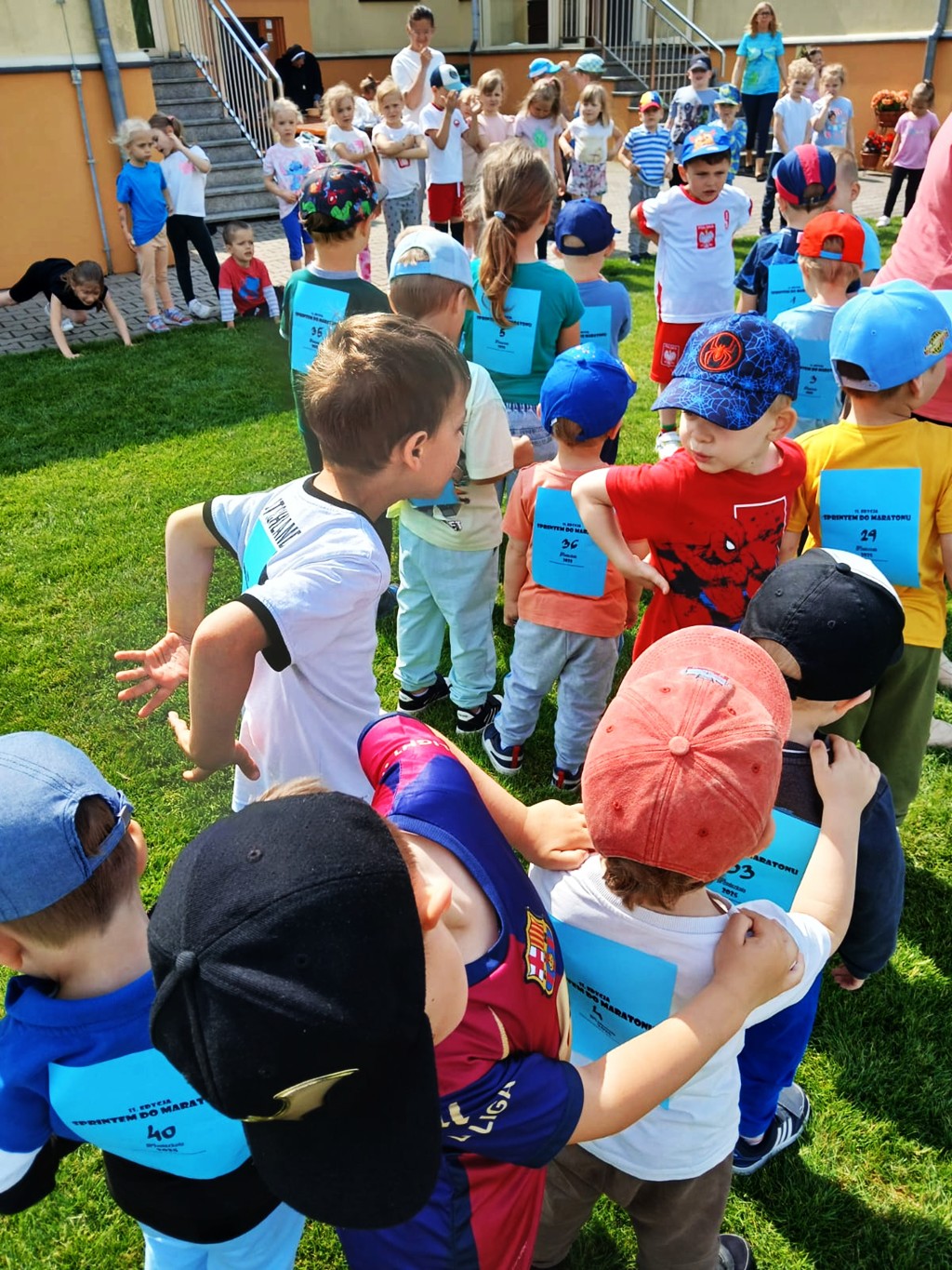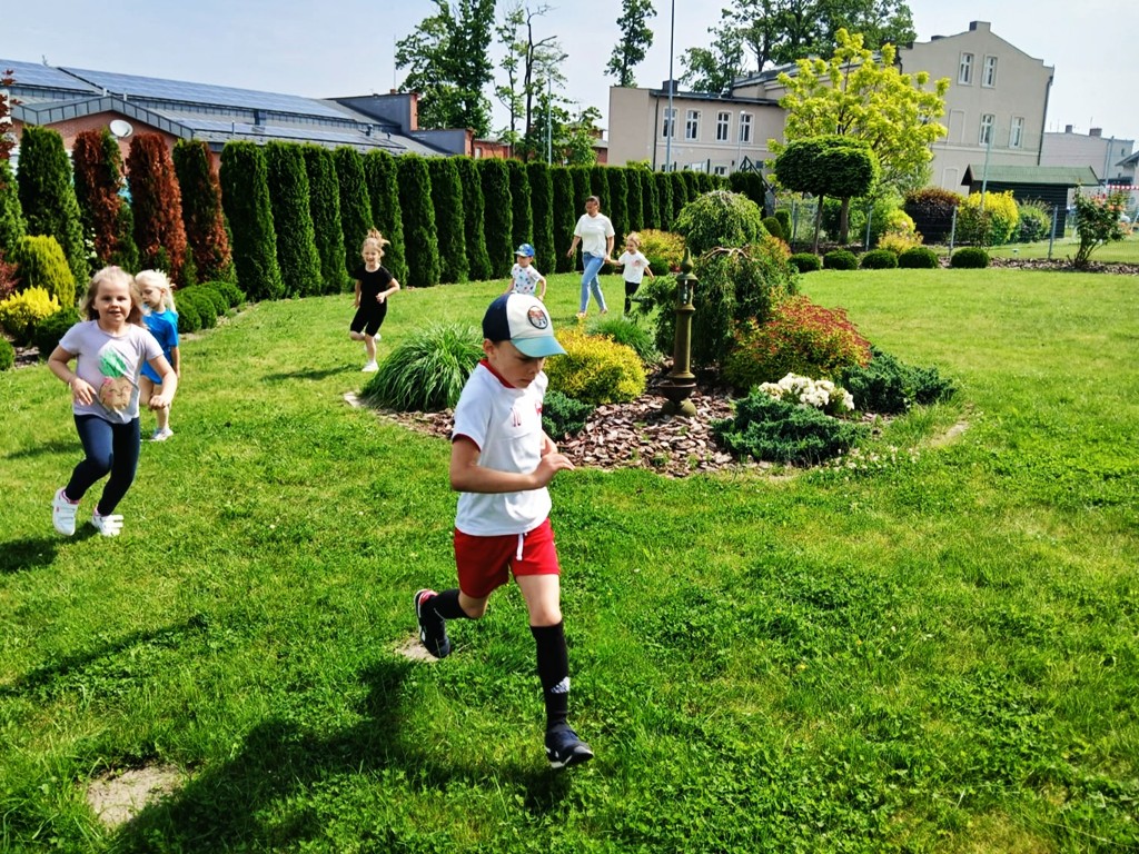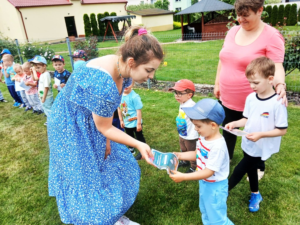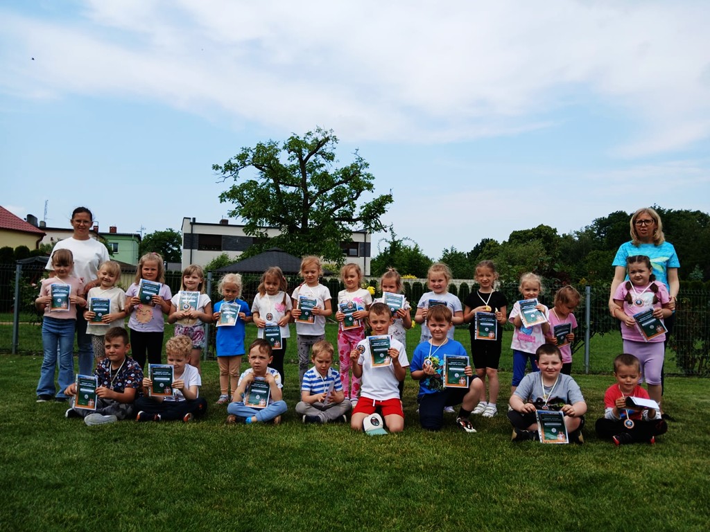 Maraton rozpoczął się od wspólnej rozgrzewki i przydziału numerów startowych. Przedszkolacy z zapałem dopingowali biegnących kolegów. 40 małych maratończyków przebiegło trasę 24 000 m! Na zakończenie każde dziecko otrzymało medal i pamiątkowy dyplom. Gratulujemy 😊
